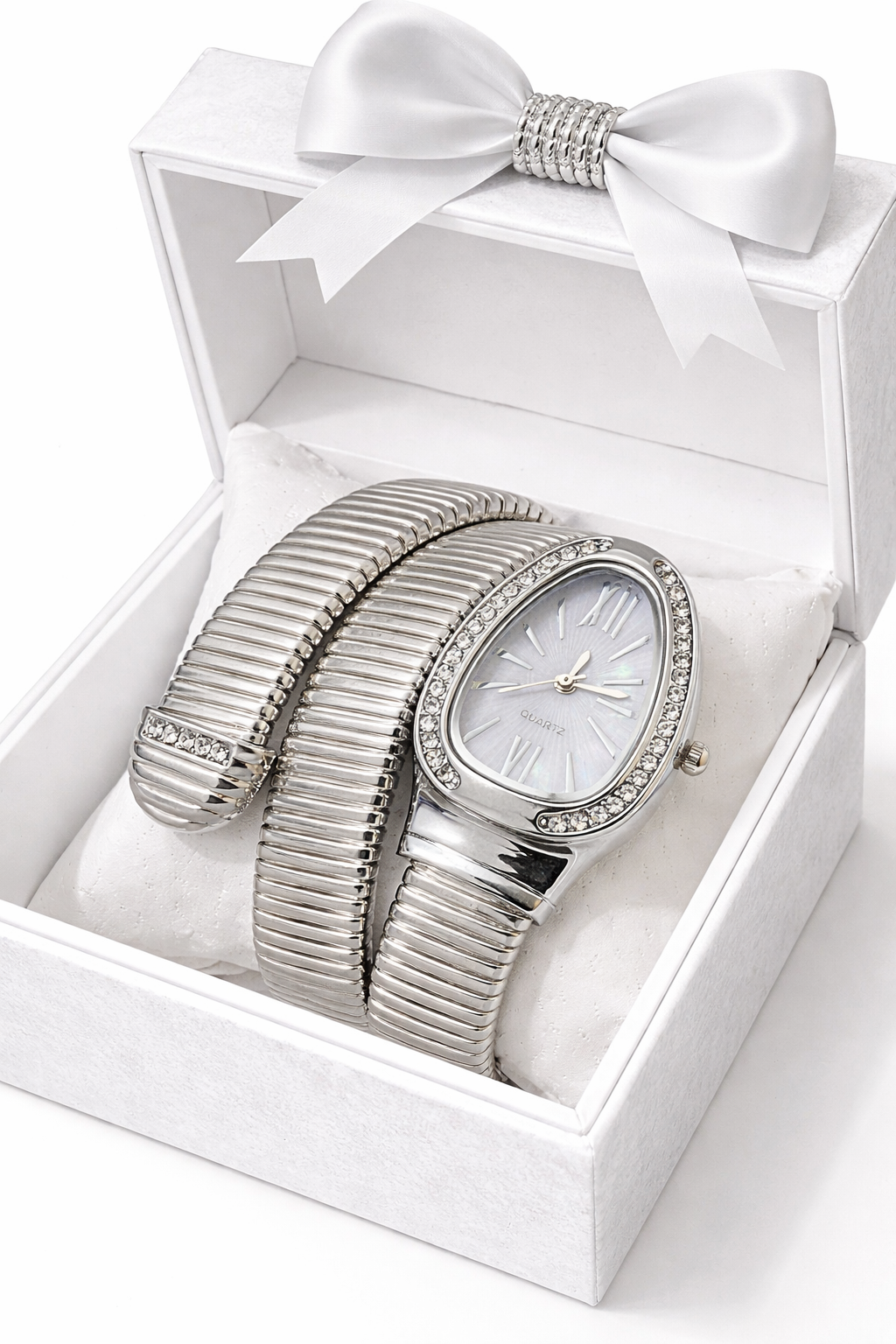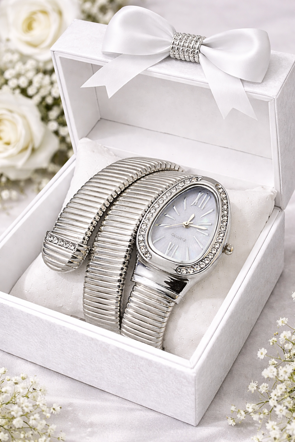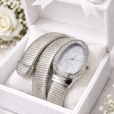 Enhance your style with the Ulltramart Silver Snake Bracelet Watch for Women, designed to add elegance and luxury to your everyday and special occasions. The flexible snake-style silver bracelet wraps smoothly around the wrist, offering a unique bangle-style look that stands out.
